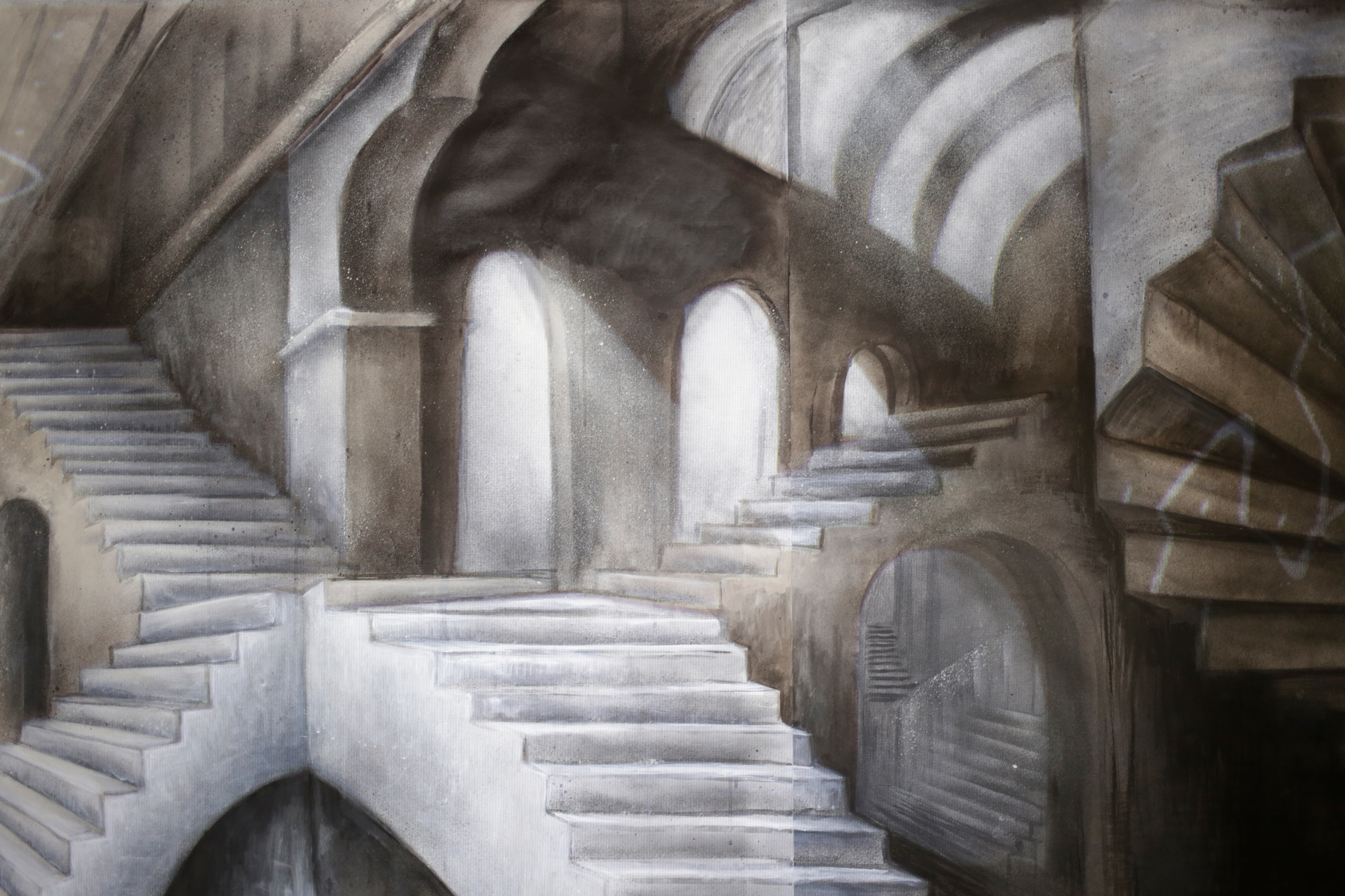 Escolhemos um padrão específico a ser projetado sobre uma pintura inspirada em um tratado do início do século XVII sobre Linear Perspective do artista holandês Vredeman de Vries. É um padrão que conta a história de um frango selvagem fugindo de um caçador. A linha representa o caminho feito pelo frango enquanto tenta enganar o caçador e exauri-lo, conseguindo finalmente retornar à sua casa escondida, localizada precisamente onde a corrida começou.